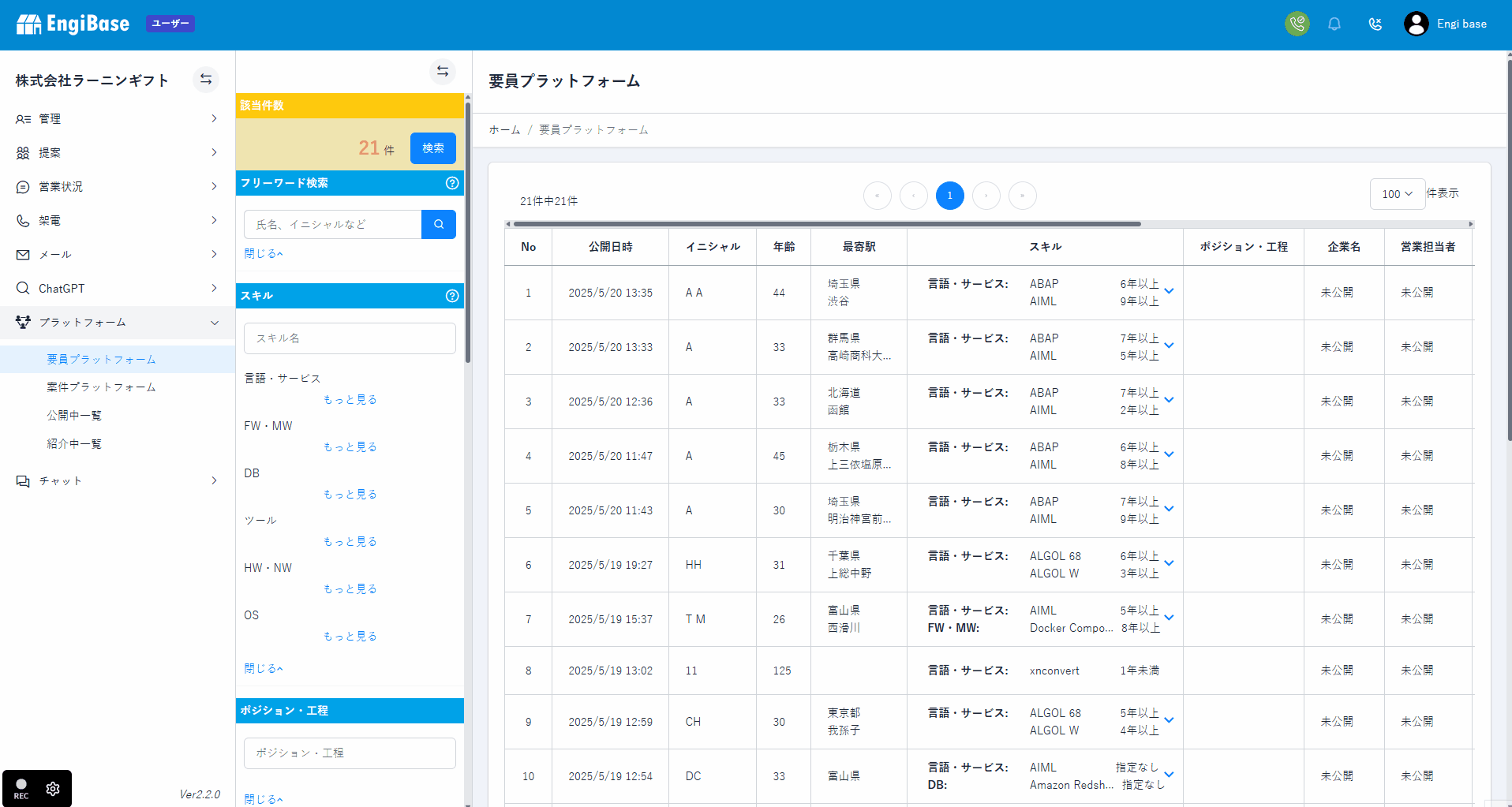 Engibaseでは、膨大なデータベースから必要な案件や要員をわずか数秒で検索できます。